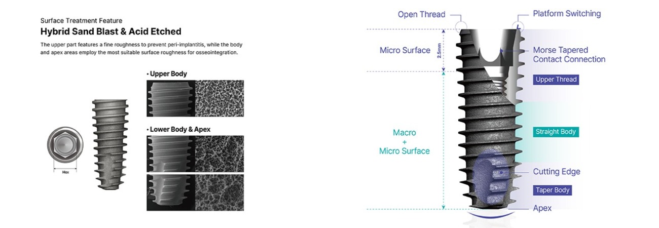 while the body and apex areas employ the most suitable surface roughness for osseointegration.
